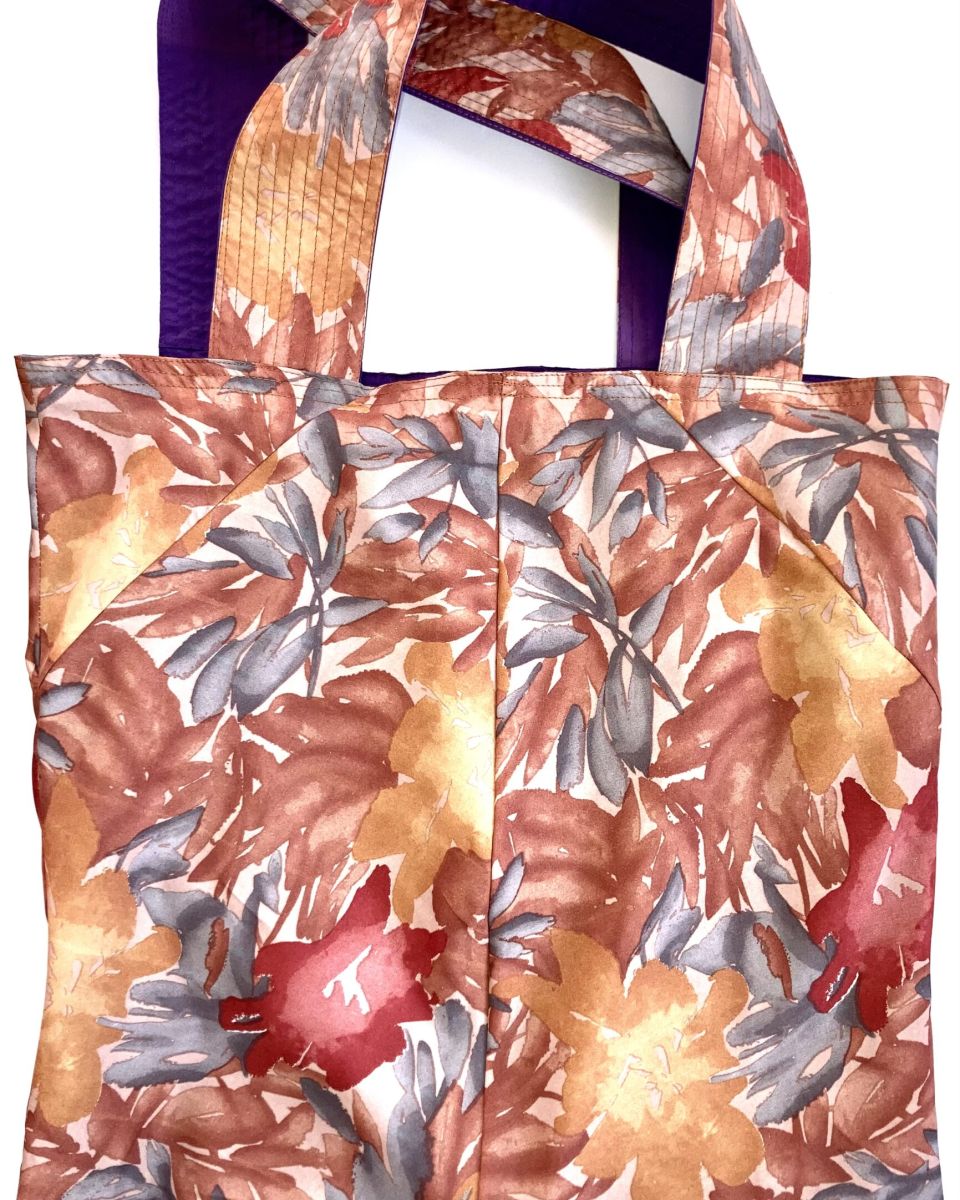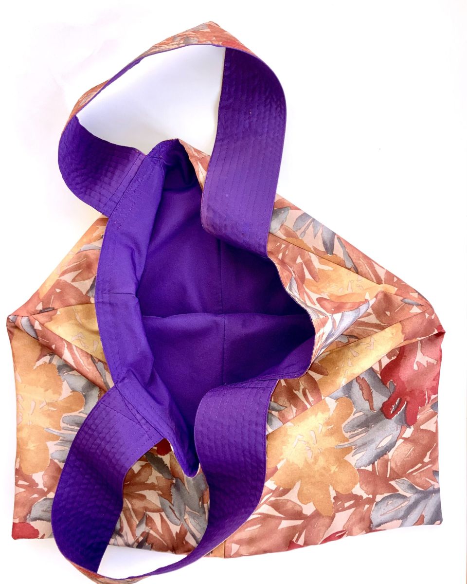 BADEN #02 TRÄGT EINE BRAUN-ICE BLUE-GOLDENE MUSTERUNG MIT EINER VIOLETTEN INNENSEITE . DIE BRAUNEN ZIERNÄHTE GEBEN DEN TASCHENHENKELN DIE NÖTIGE FESTIGKEIT.