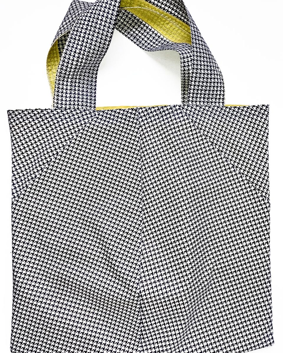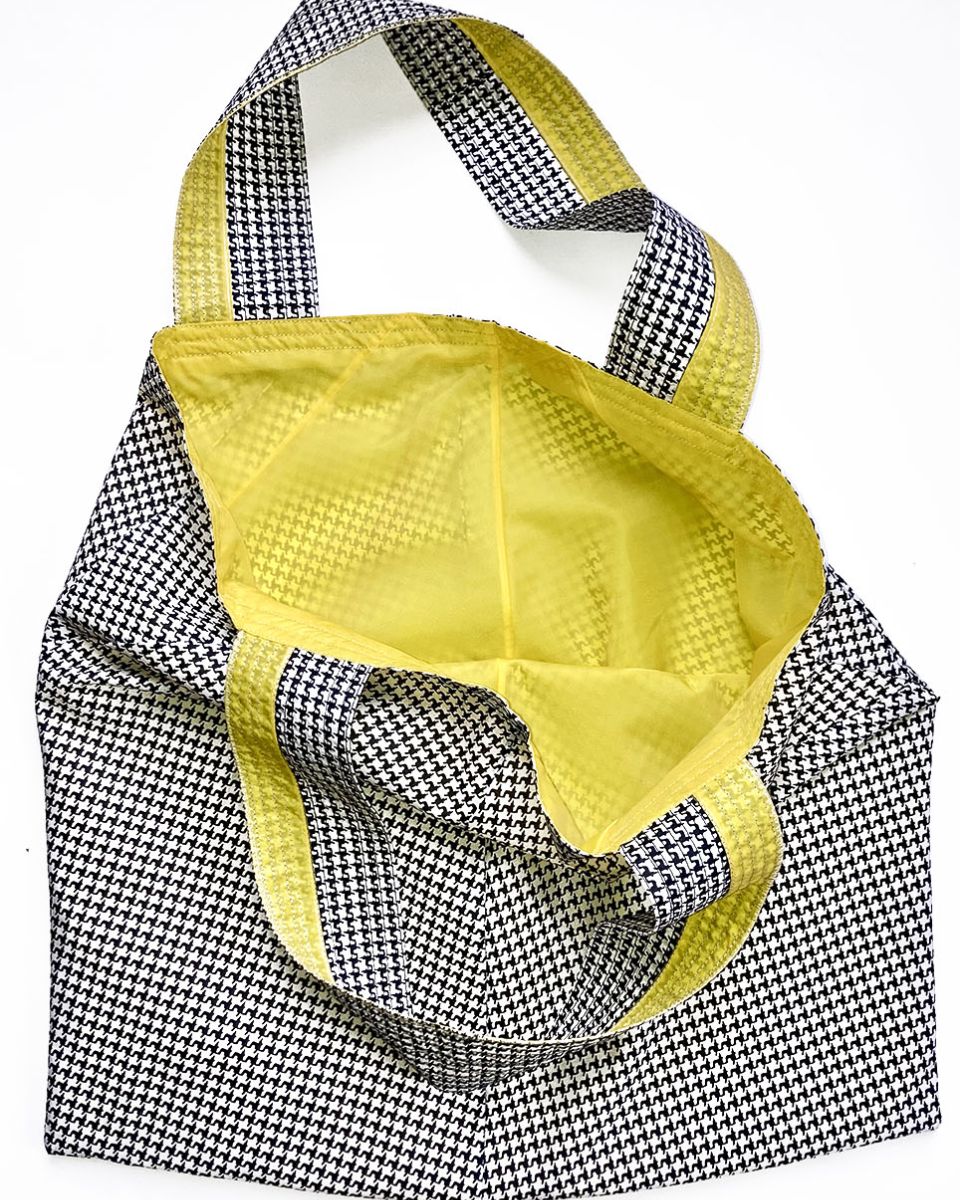 BADEN #07 KOMMT IN SCHWARZ-WEISSEM PEPITA-MUSTER MIT EINER GELBEN INNENSEITE DAHER. DIE ZIERNÄHTE IN SCHWARZ ENTLANG DEN HENKELN GEBEN DER FRANZ TASCHE DIE NÖTIGE FESTIGKEIT.