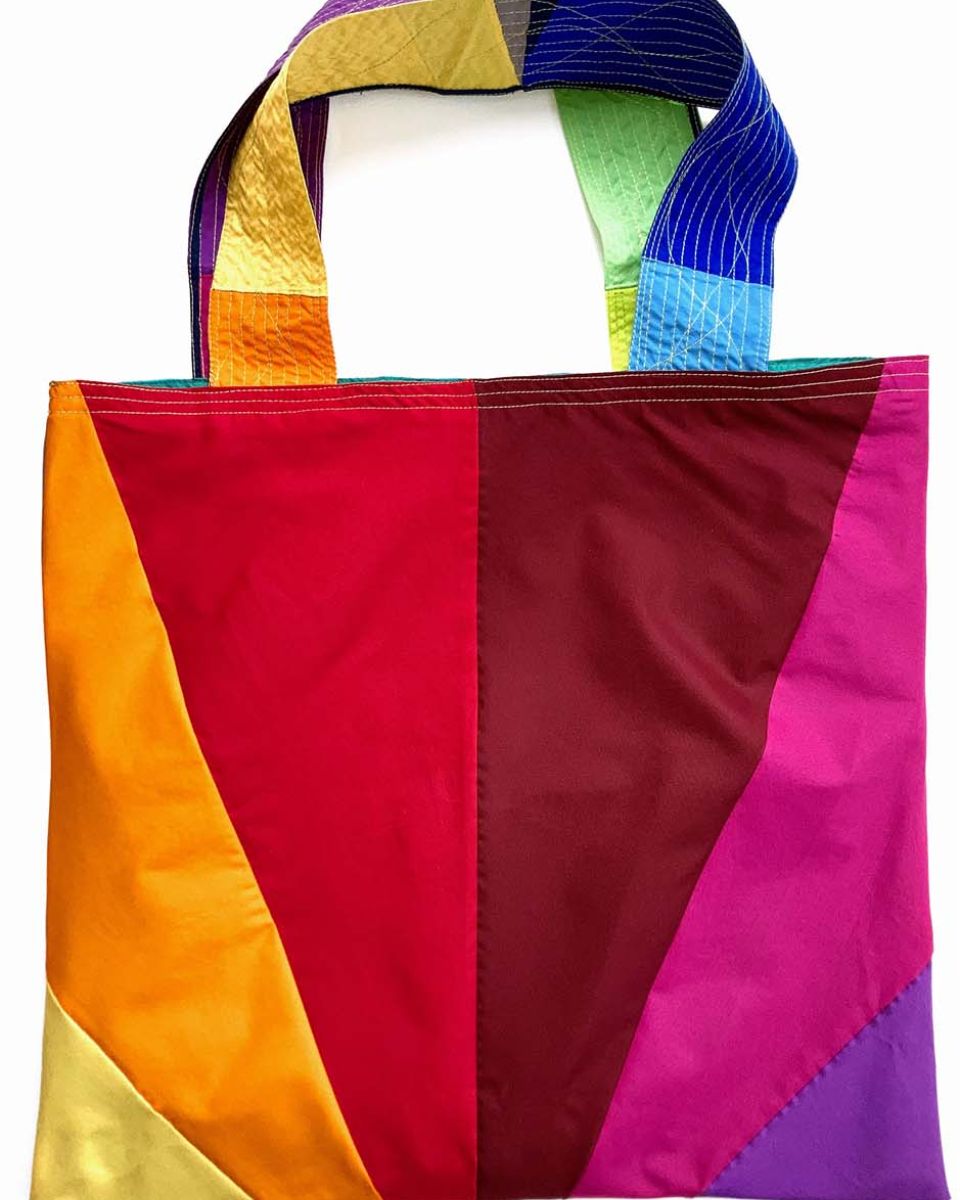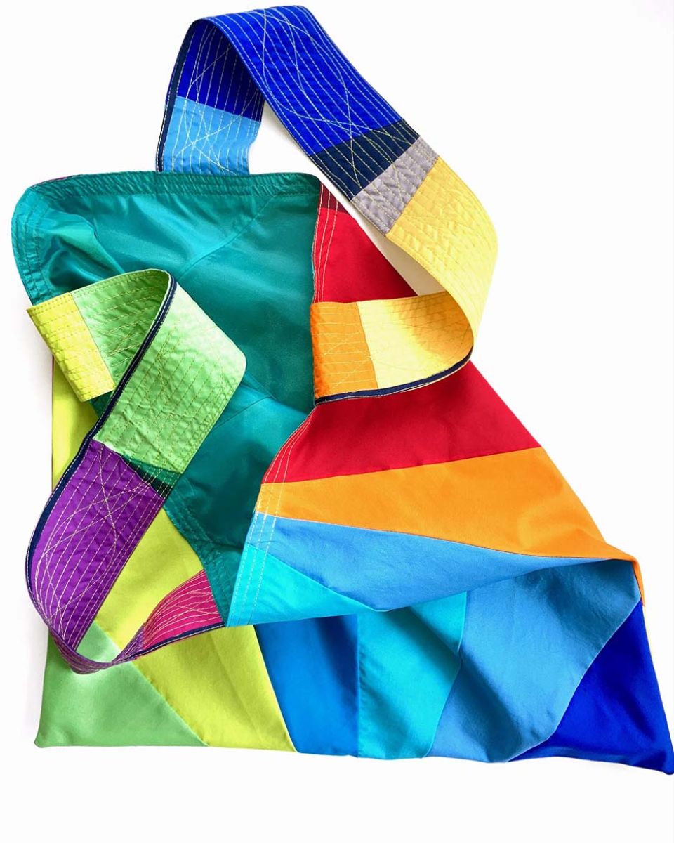 BADEN #09 KOMMT IM RAINBOW MUSTER UND EINER TÜRKISGRÜNEN INNENSEITE DAHER. DIE ZIERNÄHTE IN HELLGRÜN ENTLANG DEN HENKELN GEBEN DER FRANZ TASCHE DIE NÖTIGE FESTIGKEIT.