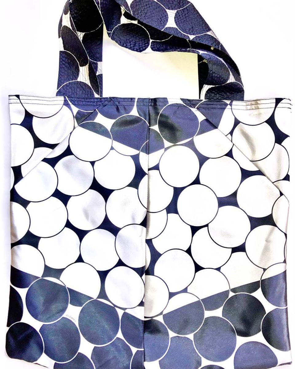 BADEN#10 KOMMT IN SCHIMMERNDER SCHWARZ-WEISS-MUSTERUNG MIT EINER SILBERNEN INNENSEITE DAHER. DIE ZIERNÄHTE IN SCHWARZ ENTLANG DEN HENKELN GEBEN DER FRANZ TASCHE DIE NÖTIGE FESTIGKEIT.