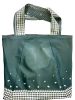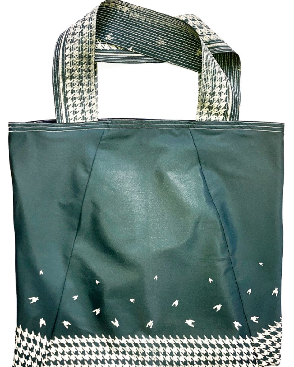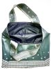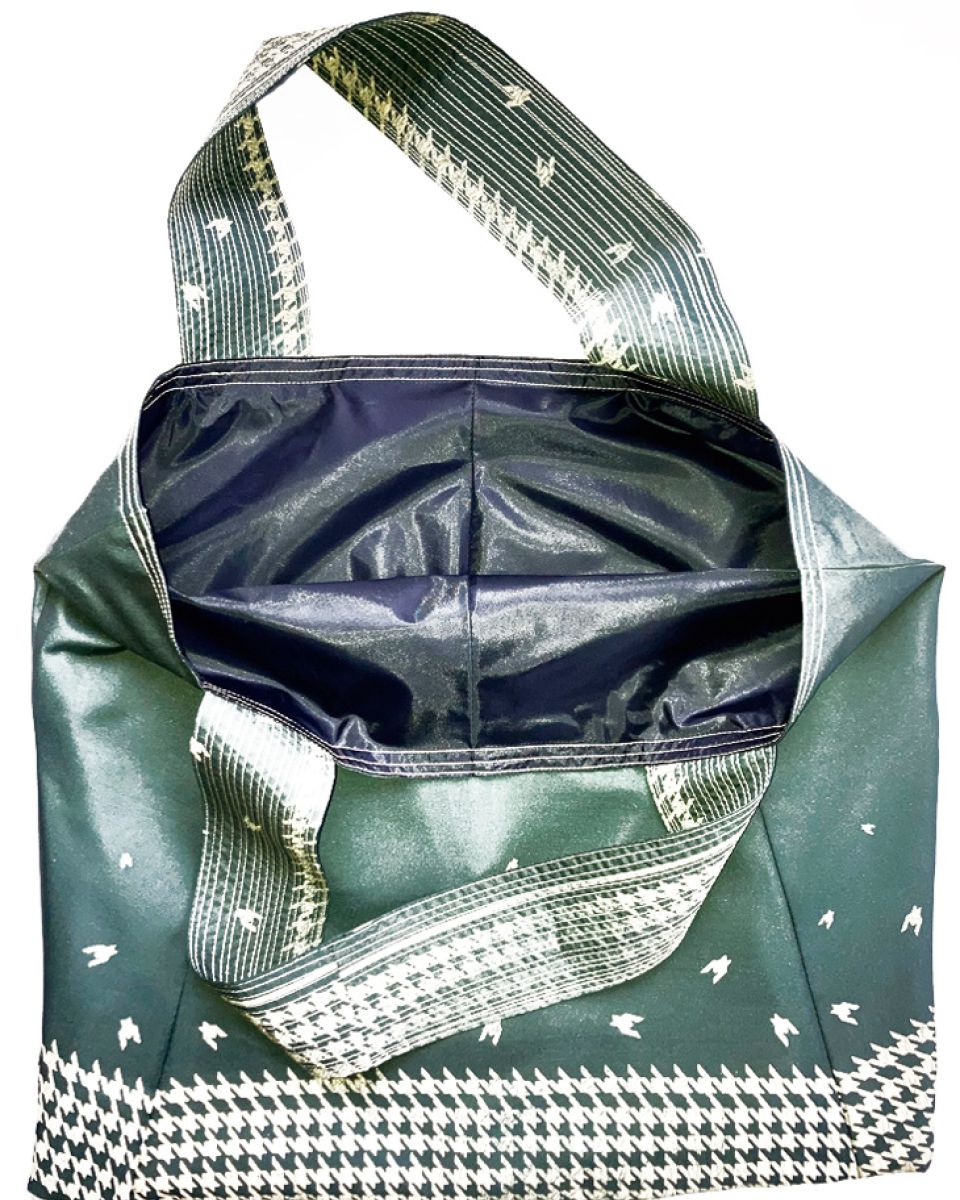 HANOI #10 TRÄGT EIN HELLGEBES MUSTER AUF DUNKELGRÜNEM UNTERGRUND MIT EINER SCHWARZ SCHIMMERNDEN INNENSEITE. DIE HELLGELBEN MEHRSPURIGEN ZIERNÄHTE ENTLANG DEN HENKELN GEBEN DER FRANZ TASCHE DIE NÖTIGE FESTIGKEIT.