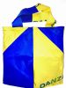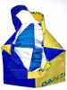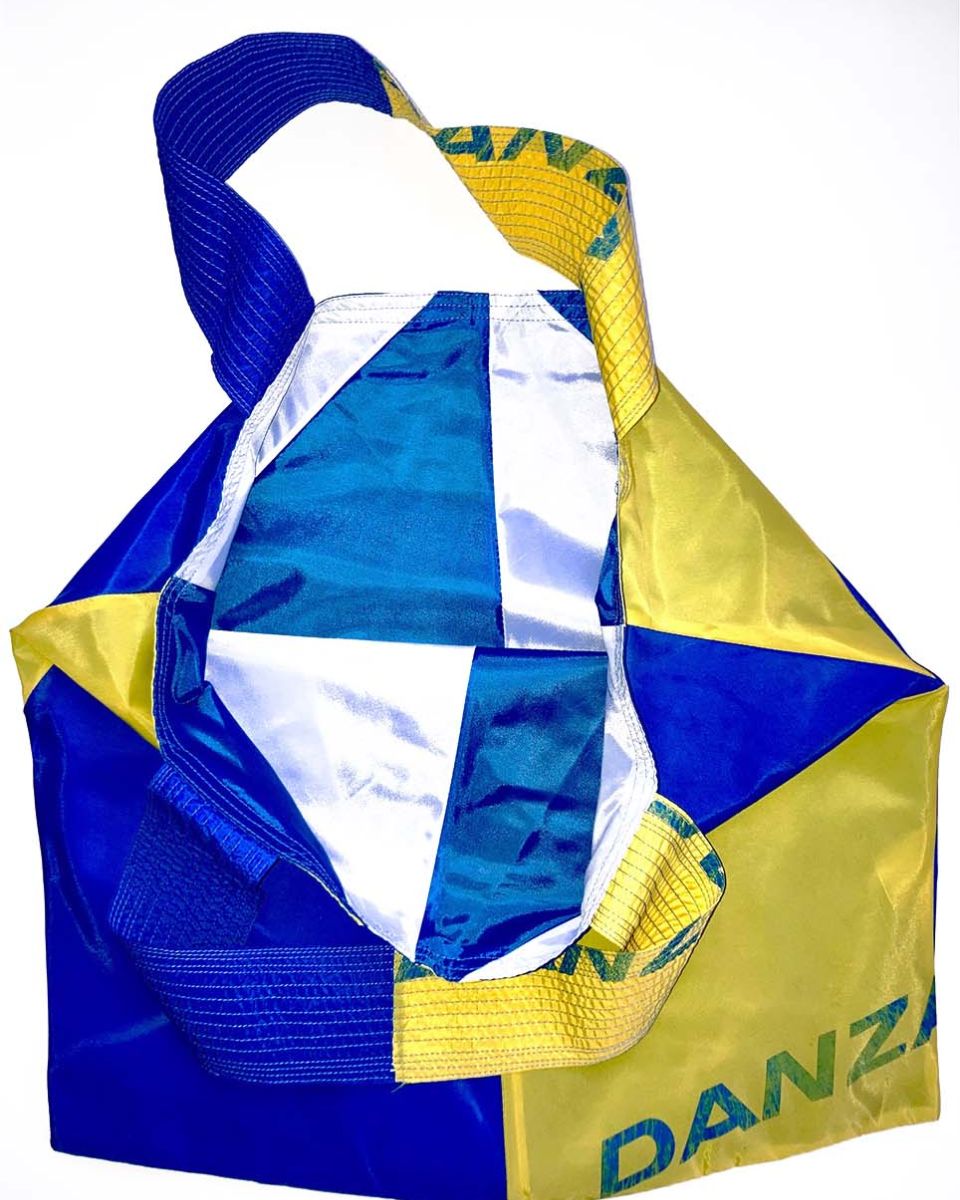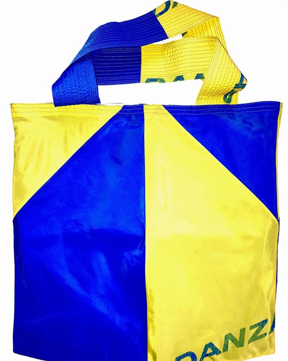 SCHAFFHAUSEN #02 KOMMT IN EINEM BLAU-GELBEN RAINBOW MUSTER MIT EINER WEISS-BLAUEN INNENSEITE DAHER. DIE BLAUEN MEHRSPURIGEN ZIERNÄHTE ENTLANG DEN HENKELN GEBEN DER FRANZ TASCHE DIE NÖTIGE FESTIGKEIT.