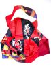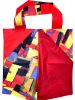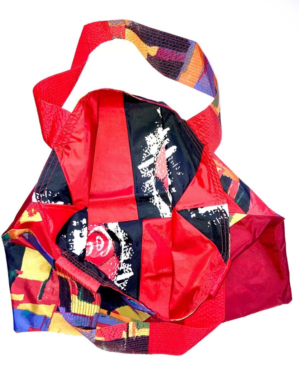 SCHAFFHAUSEN #03 KOMMT IN EINEM ROT-UND BUNT GEFLECKTEM RAINBOW MUSTER MIT EINER ROT-SCHWARZEN COCA-COLA INNENSEITE DAHER. DIE ROTEN MEHRSPURIGEN ZIERNÄHTE ENTLANG DEN HENKELN GEBEN DER FRANZ TASCHE DIE NÖTIGE FESTIGKEIT.