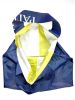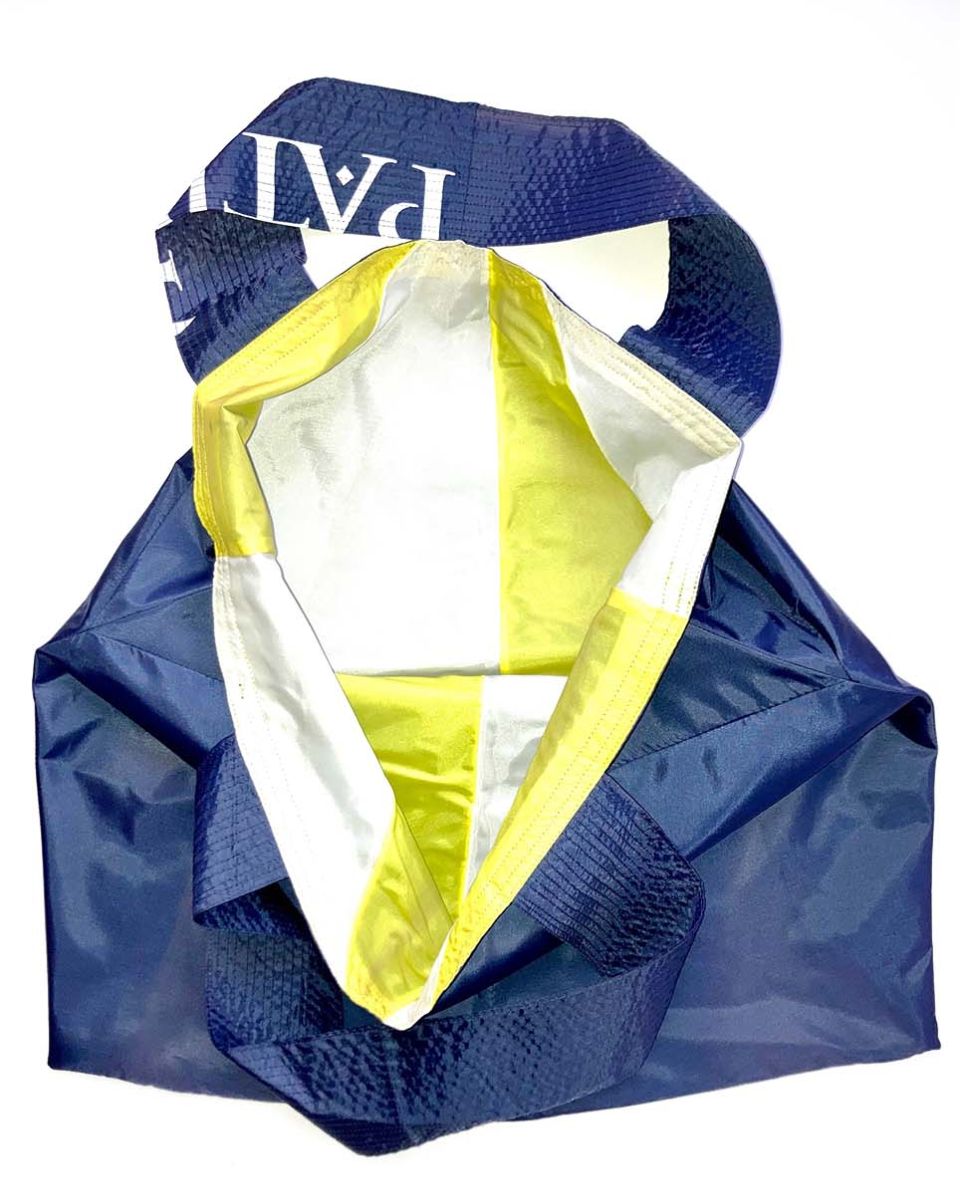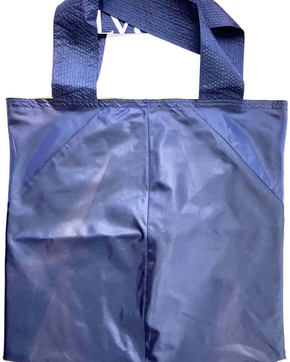 SCHAFFHAUSEN #05 KOMMT IN CHANGIERENDEM MEERBLAU MIT WEISS-GELBEM RAINBOW MUSTER AUF DER INNENSEITE DAHER. DIE DUNKELBLAU-GELBEN MEHRSPURIGEN ZIERNÄHTE ENTLANG DEN HENKELN GEBEN DER FRANZ TASCHE DIE NÖTIGE FESTIGKEIT.