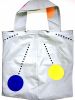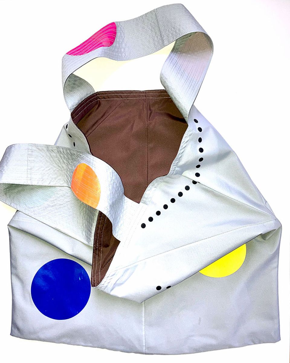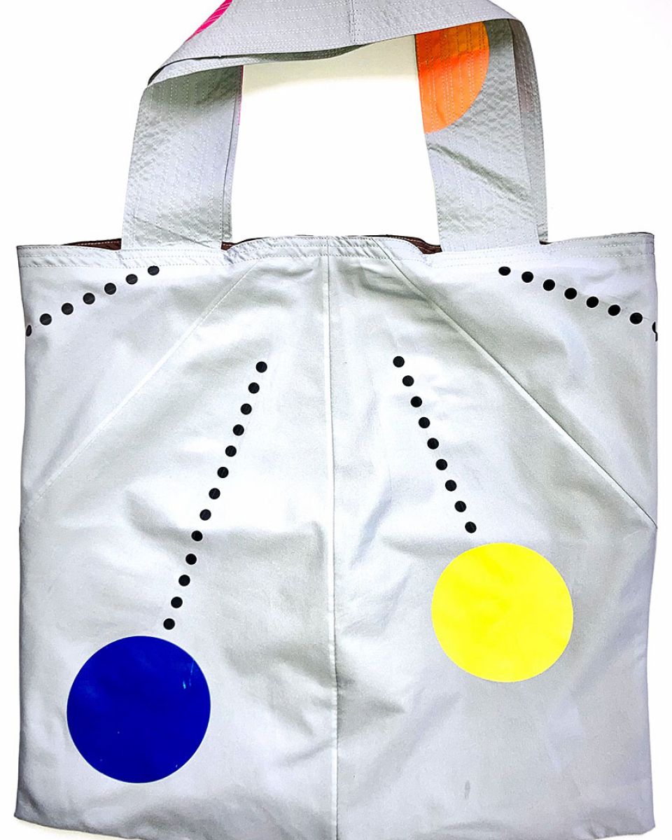 WETTINGEN #04 KOMMT IN GRAU MIT BUNTEN DOTS UND EINER BRAUNEN INNENSEITE DAHER. DIE ZIERNÄHTE IN GRAU ENTLANG DEN HENKELN GEBEN DER FRANZ TASCHE DIE NÖTIGE FESTIGKEIT.