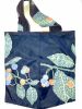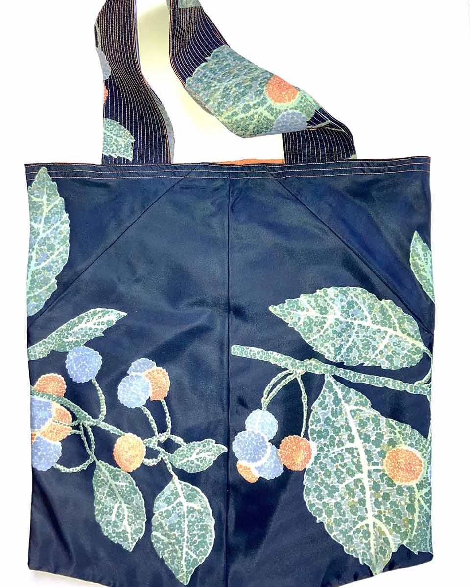 WETTINGEN #09 KOMMT IN GRÜN-BLAU-ORANGER PFLANZEN-MUSTERUNG AUF DUNKELBLAU MIT EINER ORANGEN INNENSEITE DAHER. DIE ZIERNÄHTE IN ORANGE ENTLANG DEN HENKELN GEBEN DER FRANZ TASCHE DIE NÖTIGE FESTIGKEIT.