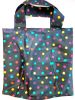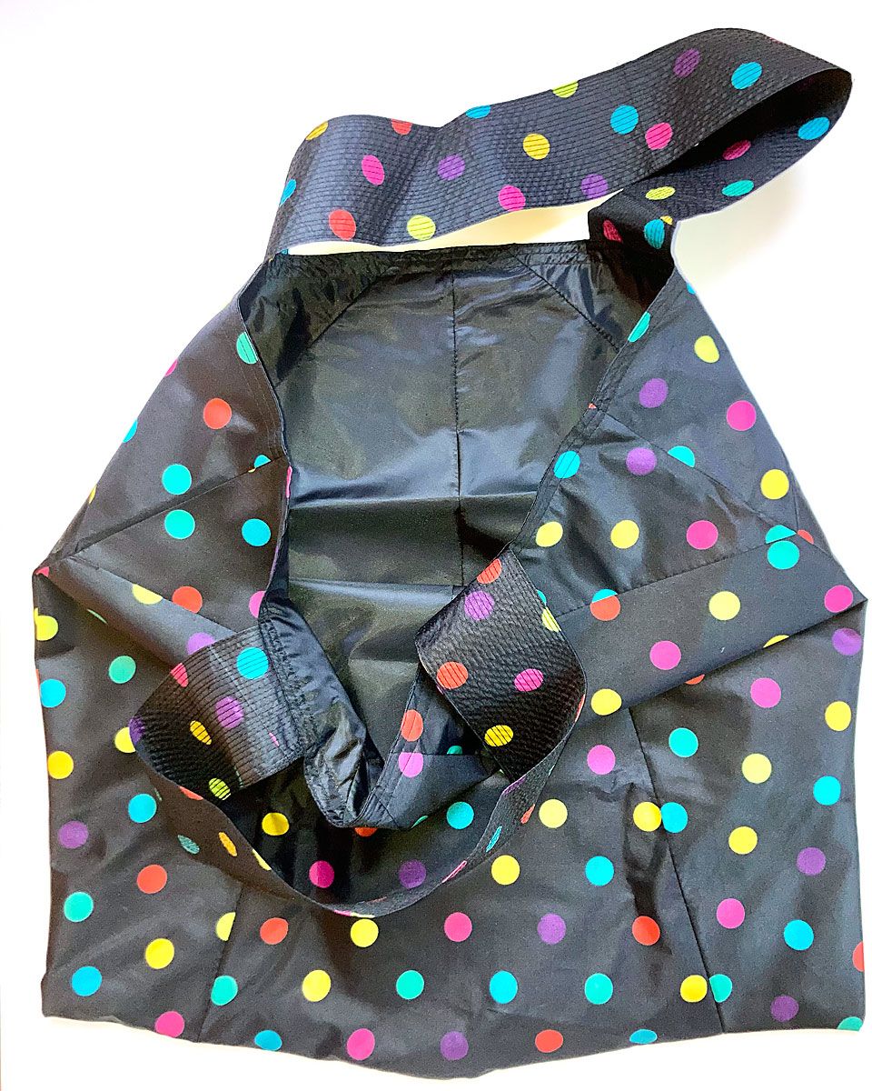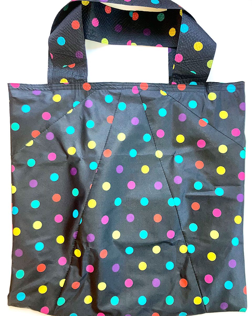 ZÜRICH #13 TRÄGT VIELE BUNTE PUNKTE AUF SCHWARZEM HINTERGRUND MIT EINER SCHWARZEN INNENSEITE. DIE MEHRSPURIGEN, SCHWARZEN ZIERNÄHTE ENTLANG DEN HENKELN GEBEN DER FRANZ TASCHE DIE NÖTIGE FESTIGKEIT.